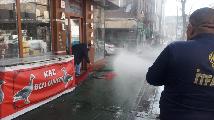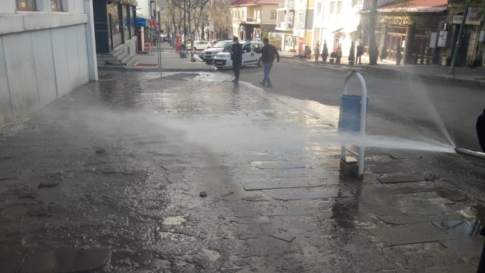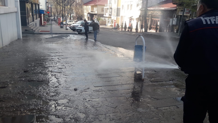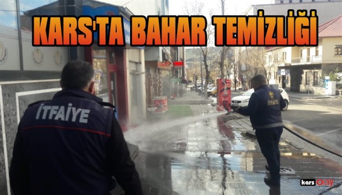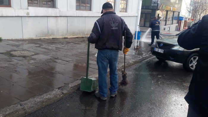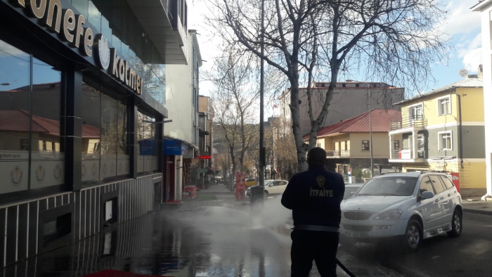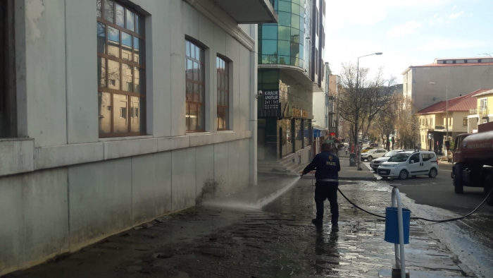 Kars Olay- Kars Belediyesi üç günlük sokağa çıkma yasağıyla birlikte boş olan şehri cadde cadde, sokak sokak tazyikli suyla yıkıyor.