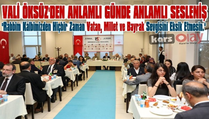 Kars’ın hain darbe girişimini Ankara ve İstanbul’dan sonra en ağır şekilde yaşamasına rağmen Gazi Kars’ın kahraman ve vatansever insanlarının bu ihanete canları pahasına karşı koyduğunu, göğsünü siper ederek bu ihanet şebekesine dur dediğini vurgulayan Vali Öksüz: “Aziz milletimiz ve Kars halkı, vatan sevgisinin, fedakârlığın, cesaretin, yiğitliğin, bir hilal uğruna şehadete yürümenin ne demek olduğunu darbecilere ve arkasındaki zihniyete bir kez daha göstermiştir. Aziz milletimiz, ülkemizin bekası için fedakârca bir direniş göstererek hainlere boyun eğmedi, bu işgale izin vermedi ve bu hain plana engel oldu ve ülkemizin bekası için bu hain darbe girişimini asla unutmayacak, dünya durdukça FETÖ ile mücadelesine devam edecektir. Şehitlerimizin hatırasını sonsuza kadar yaşatmak, hepimizin vatandaşlık borcu olduğu gibi Türkiye Cumhuriyeti devletinin en önemli görevidir. Bunun bilincinde olmak da her Türk vatandaşının görevidir. Canları uğruna bu vatanı bizlere emanet eden, devletimizin ve milletimizin bekası uğrunda büyük fedakârlıklar gösteren aziz şehitlerimizi ve kahraman gazilerimizi hiçbir zaman unutmayacağız. Sizler aziz şehitlerimizin, devletimize ve bizlere emanetisiniz. Sizlere karşı sorumluluklarımızın farkındayız ve ne yapsak sizlerin hakkını ödeyemeyiz. Bizler, her zaman sizlerin derdine derman olmaya, sıkıntılarınıza çözüm üretmeye, hüzün ve sevinçlerinizi paylaşmaya hazırız. Valilik ve diğer kamu kurum ve kuruluşları olarak sizlerle ilgili her meseleyi ve sizlerin taleplerini kendi meselemiz bilip, yakından takip etmeye çalışıyoruz. Tüm kurum, kuruluşlarımız ve imkânlarımızla yanınızda olduğumuzu bilmenizi istiyorum. Bu vesileyle; ebediyete intikal eden tüm şehitlerimizi bir kez daha rahmetle, minnetle anıyorum. Hepinize mutlu, huzurlu, sağlıklı günler diliyor, saygılarımı sunuyorum.” Şeklinde konuştu.