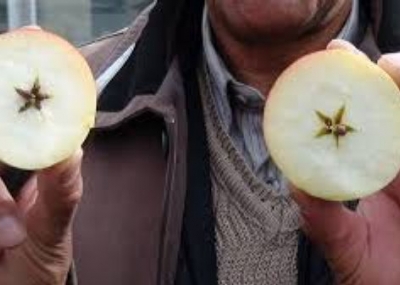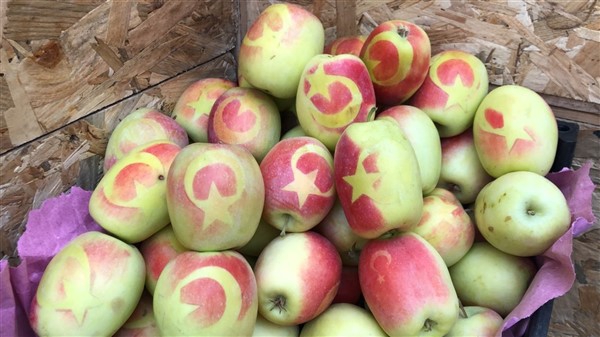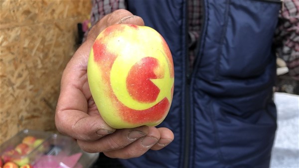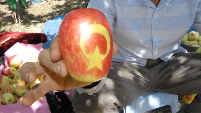Kars Olay- Türkiye’de sadece Kars'ın Kağızman’ ilçesinde yetişen tadı ve aromasıyla iştah kabartan tescilli uzun elma olgunlaşma sürecinde yapıştırılan etiketler sayesinde ortaya çıkan Türk bayrağı deseniyle yoğun ilgi görüyor.