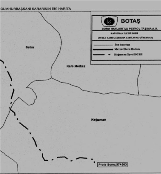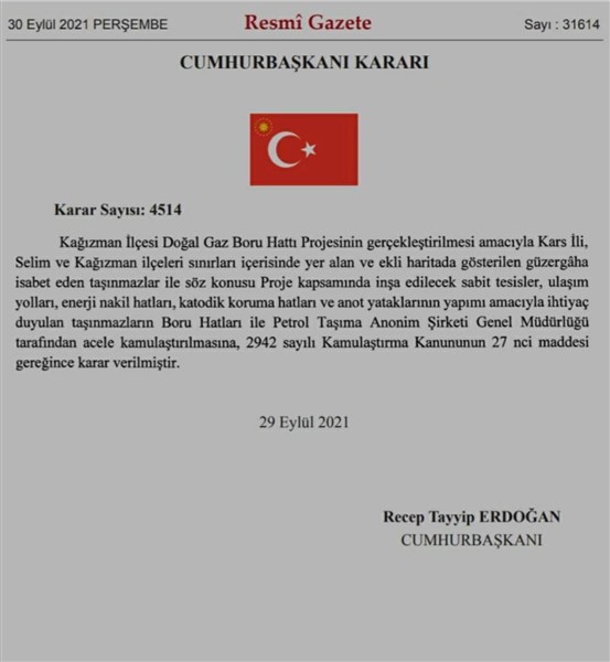Kars Olay- Cumhurbaşkanı Recep Tayyip Erdoğan imzasıyla Resmi Gazete'de yayımlanan 2021/34614 sayılı Bakanlar Kurulu Kararı ile Kağızman ilçesi Selim ve Kağızman ilçesi hudutlarında doğalgaz getirilmesi amacıyla acele kamulaştırma kararı çıktı.