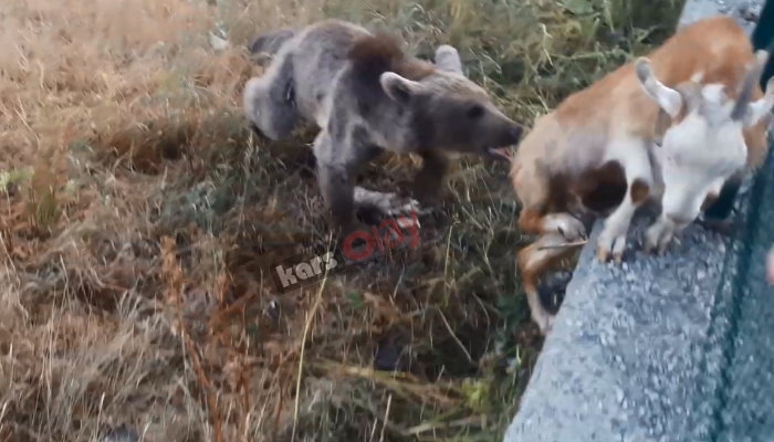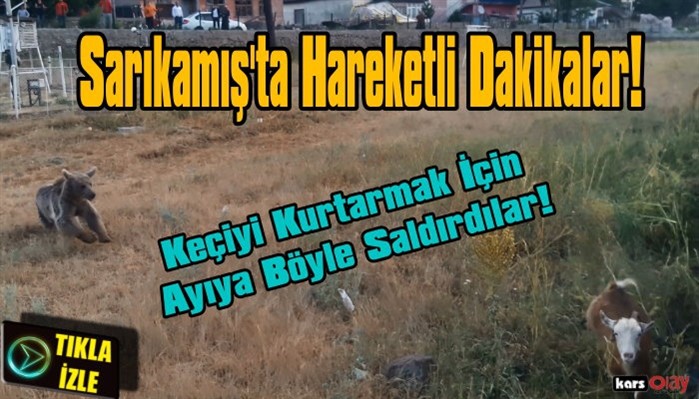 Kars Olay- Boz ayıların mesken tuttuğu Kars’ın Sarıkamış ilçesinde aç kalan bir ayının yiyecek bulmak için şehir merkezine inmesi sonucu trafik felç olurken Boz Ayının keçiye saldırma anları ise hareketli dakikalar yaşanmasına neden oldu.