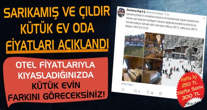 Sarıkamış Dağ A.Ş’den Yapılan Açkıklamada Şöyle Denildi; ”Sarıkamış Kütük Ev konaklama bölümü ile hizmetinizde. Kayak merkezimizin hemen yanı başında muhteşem manzara eşliğinde konaklama bölümü ile hizmetinizdeyiz. Kahvaltı dâhil oda fiyatı hafta içi 250 TL, hafta sonu 300 TL İletişim: 0474 413 54 54”