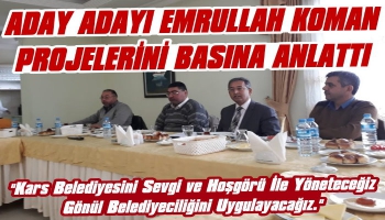 Kars Olay- 2019 Mart yerel seçimleri için memleketi Kars'ta AK Parti'den Belediye Başkan Aday adaylığı başvurusunu yapan İnşaat Mühendisi Emrullah Koman, DSİ 24. Bölge Müdürlüğü sosyal tesislerinde basın mensuplarına projeleri ve süreçle ilgili açıklamalarda bulundu.