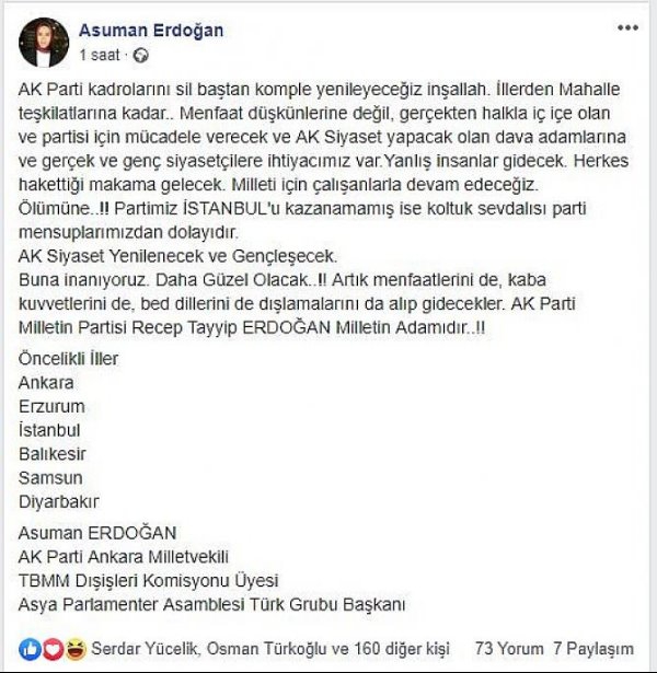 Kars Olay-Bugün akşam saatlerinde AK Parti Ankara Milletvekili Asuman Erdoğan isimli hesaptan yapılan paylaşım siyaset gündemine bomba gibi düştü..