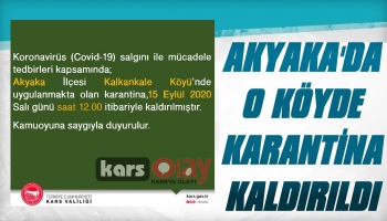 Kars Valiliği'nden yapılan açıklamada: "Koronavirüs (Covid-19) salgını ile mücadele tedbirleri kapsamında; Akyaka İlçesi Kalkankale Köyünde uygulanmakta olan karantina 15 Eylül 2020 Salı günü saat 12.00 itibariyle kaldırılmıştır." denildi.