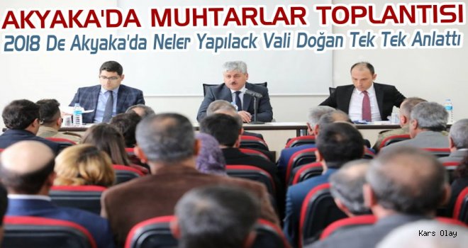 Kars Olay-Akyaka Kaymakamlığı Toplantı Salonunda düzenlenen toplantıda; Akyaka ilçesinde yıl içerisinde yürütülecek çalışmalar hakkında muhtarlarla istişarede bulunan Kars Valisi Rahmi Doğan, ilçedeki köy yolları, yayla yolları, içme suyu ile diğer çalışmalar hakkında muhtarlara bilgiler verdi.