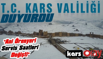 Kars Olay- Kars Valiliği'nden yapılan yazılı açıklamada; "Kars – Ani Antik Kenti arası yolcu taşımacılığına ilişkin zaman tarifesi mevsim şartları göz önünde bulundurularak 13 Mayıs 2019 tarihinden itibaren geçerli olmak üzere yeniden güncellenmiştir. Kamuoyuna saygıyla duyurulur." denildi.
