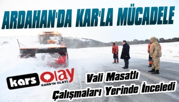 Kars Olay-Ardahan Valisi Mustafa Masatlı, ili genelinde etkili olan kar ve fırtına sebebiyle ulaşıma kapanan yolları açık tutmak için mesai yürüten karla mücadele ekiplerinin çalışmalarını yerinde takip etti.