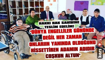 Kars Olay-Selim Belediye Başkanı Coşkun Altun 3 Aralık Dünya Engelliler Günü dolayısıyla yayınladığı mesajında şu cümlelere yer verdi: "Engelli vatandaşlarımızın toplumsal yaşama katılımlarını kolaylaştırmak, desteklemek, önlerindeki tüm engelleri kaldırmak, onlara hak ettikleri sevgi ve saygıyı göstermek hepimizin sosyal sorumluluğudur. Toplumu oluşturan tüm bireyler eşit hak ve özgürlüklere sahiptir. Engelli vatandaşlarımızın yaşama sevincini yitirmeden mutlu bir yaşam sürmeleri için çaba gösterilmesi, gerek birey olarak gerekse Devlet ve toplum olarak temel sorumluluğumuzdur. Engelli bireylerimize toplum olarak daha çok sahip çıktığımız güzel günleri görmek dileğiyle tüm engelli vatandaşlarımızın 3 Aralık Dünya Engelliler Günü’nü kutluyor, yaşam mutluluklarının arttığı, engellerinin ortadan kalktığı sağlıklı günler diliyorum."