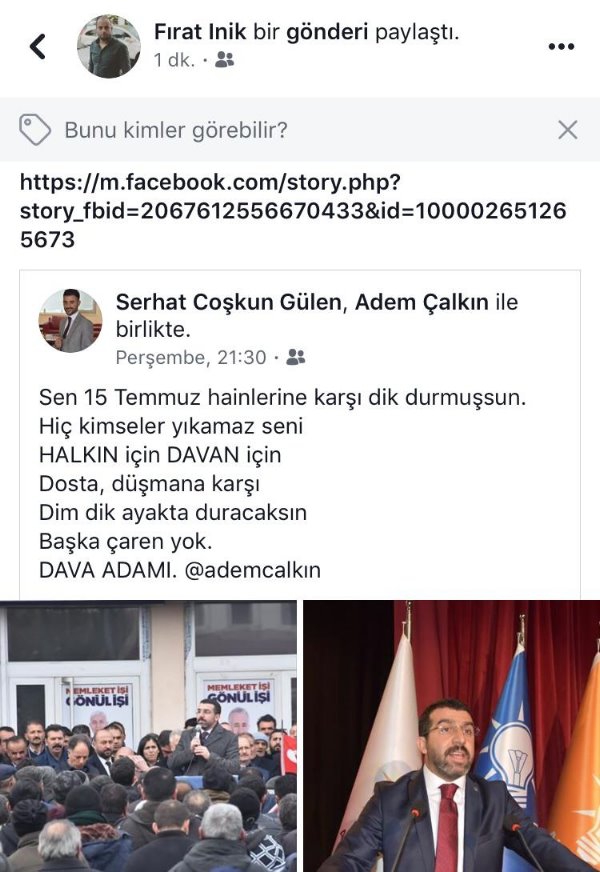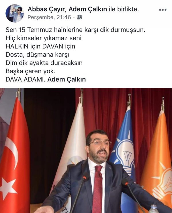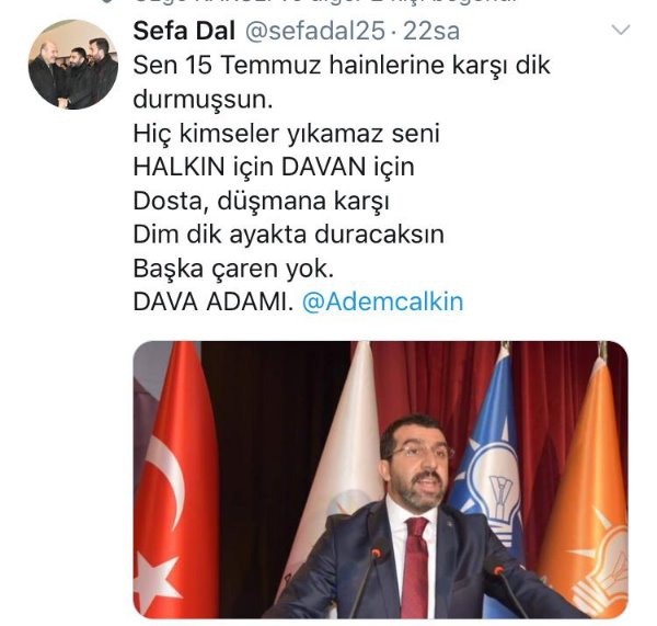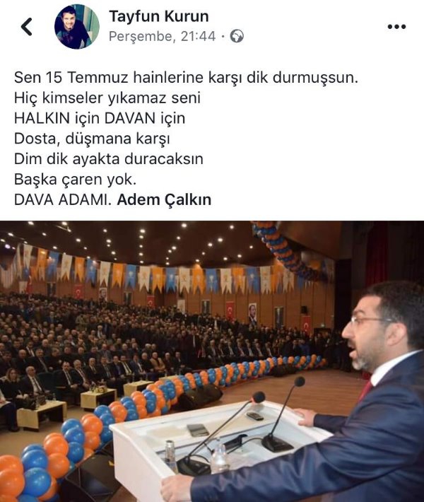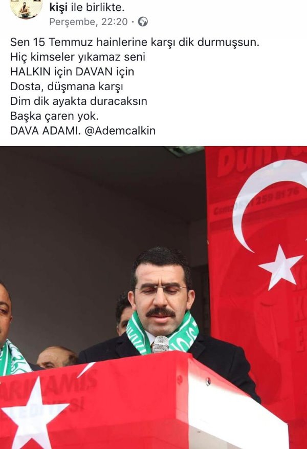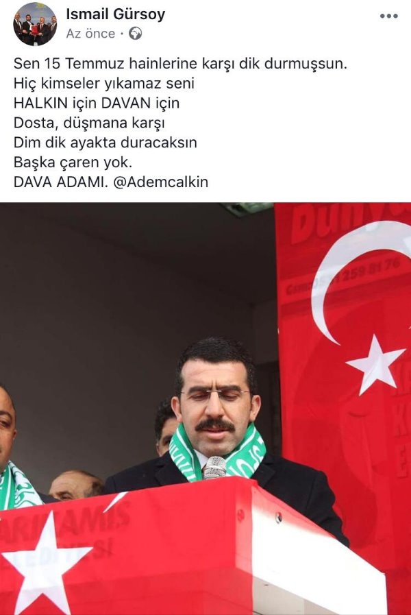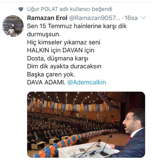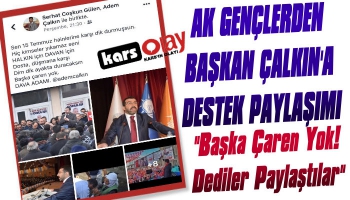Kars Olay- AK Parti Kars İl Başkanı Adem Çalkın sevgisi bu sefer sosyal medyada paylaşım konusu oldu. AK Parti Kars Gençlik Kollarında görevli Gençlik Kolları Çevre Şehir ve Kültür Bakanlığı Birim Başkanı Serhat Çoşkun Gülen’in sosyal medya hesabından Adem Çalkın için yaptığı paylaşım diğer AK Parti Gençlik kolları üyelerinin tamamı tarafından da paylaşıldı. Birim Başkanı Serhat Coşkun Gülen 15 Temmuz Hain Darbe gecesinde yaşananlara atıfta bulunarak Başkan Çalkın için o hain gece dimdik ayakta durdun Halkın için Davan için dimdik ayakta durmaya devam edeceksin başka çaren yok diyerek Başkan Çalkın’a destek mesajı verdi. Paylaşımın ardından onlarda kişinin aynı yazıyı paylaşması ise AK Parti gençlik teşkilatının Başkan Çalkın’a desteğini ortaya koymuş oldu.