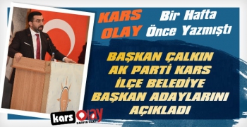 Kars Olay-KarsOlay'ın biir hafta önce okuyucularına duyurduğu AK Parti'nin Kars'ın ilçelerinde 2019 Mart yerel seçimlerine gireceği adaylara ait ilk resmi açıklama İl Başkanı Adem Çalkın'dan geldi. Başkan Çalkın'ın sosyal medya hesabı twitter üzerinden yaptığı paylaşımda ilçe ve belde belediye başkan adaylarının isim listesini açıkladı.