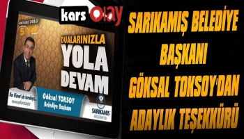 Kars Olay- 31 Mart 2019'da yapılacak olan yerel seçimler için Sarıkamış Belediyesi için AK Parti'den yeniden aday olarak gösterilen Belediye Başkanı Göksal Toksoy bir teşekkür mesajı yayınlayarak ilk günden itibaren bize sahip çıkan ve desteklerini hiç esirgemeyen tüm hemşehrilerime teşekkür ediyorum dedi.