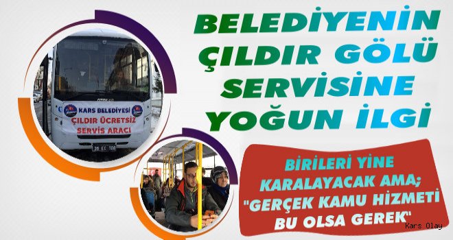 Kars Olay-Belediye Başkanı Murtaza Karaçanta’nın talimatı ile Kars turizmine katkı sağlamak amacıyla hayata geçirdiği Çıldır Gölü Kütük Ev, ücretsiz servis aracına talep her geçen gün geçtikçe artıyor. Kars Belediyesi’ne ait otobüs yerli ve yabacı turistleri Çıldır Kütük Eve taşıyor.