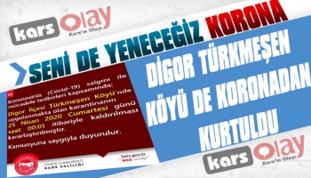 Kars Olay-Kars Valiliği Koronavirüs tedbirleri kapsamında 30 Mart 2020 Günü karantina altına alınan Digor İlçesi Türkmeşen köyünde karantina kaldırıldı.