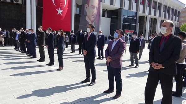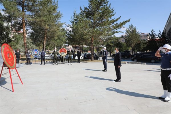 Hükümet Konağı önündeki Atatürk Anıtına Valilik Makamı, Garnizon Komutanlığı ve Belediye Başkanlığı çelenklerinin sunumu ile başlayan tören, saygı duruşu ve İstiklal Marşımızın okunması ile devam etti.
