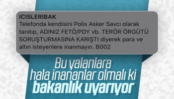 Bakanlıktan gelen mesajda; "Telefonda kendisini Polis Asker Savcı olarak tanıtıp, ADINIZ FETÖ/PDY vb. TERÖR ÖRGÜTÜ SORUŞTURMASINA KARIŞTI diyerek para ve altın isteyenlere inanmayın." ifadeleri yer aldı.