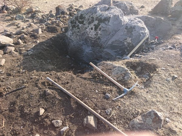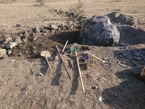 İzinsiz kazı yapılan alanda 1x1 metre genişliğinde yarım metre derinliğinde çukur bulunmuş olup; 1 adet levye demiri, 1 adet çekiç, 1 adet keser, 1 adet demir çubuk, 1 adet balyoz, 3 adet murç, 1 adet kazma, 2 adet kürek ele geçirilmiştir. Şüpheli şahıslar ile ilgili adli işleme başlanılmıştır.