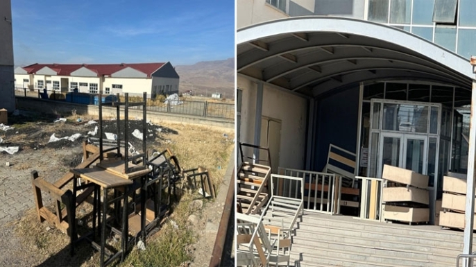 Okulun atölye girişlerinde insan boyunu geçen otlar, uzun süredir içeri adım atılmadığını gösteriyor. Bahçede ve okul duvarlarında çıkan yabani otlar, etrafa saçılmış çöpler ve bakımsızlık, sanki yıllardır terk edilmiş bir yapı izlenimi veriyor.