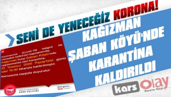 Kars Olay-Kars Valiliği Koronavirüs tedbirleri kapsamında 04 Temmuz 2020 Günü karantina altına alınan Kars'ın Kağızman ilçesi Şaban Köyü'nde karantina kaldırıldı.