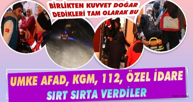 Görüş mesafesinin güçlükle sağlandığı yoğun kar ve tipiye kaşı ekiplerin müdahalesi sonucunda hastalara saat: 24.00’de ulaşıldı. UMKE ekiplerinin ilk müdahalesinden sonra hastalar saat: 01.30’da Kağızman Devlet Hastanesi’ne nakledildi.