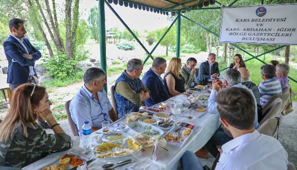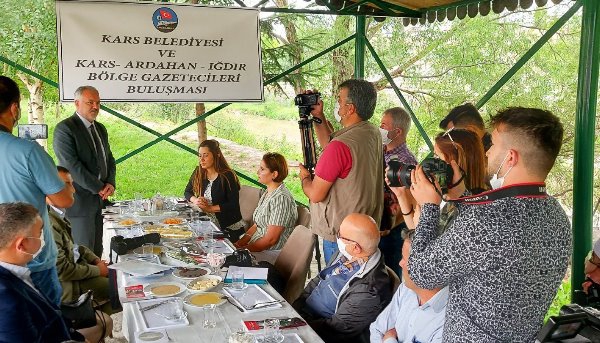 Kars Olay-Kars Belediyesi Mor Kafe’de düzenlenen Kars, Ardahan ve Iğdır gazetecileriyle Kahvaltı Organizasyonunda konuşan Başkan Şevin Alaca “Göreve geldiğimiz günden bu zamana kadar belediyenin mevcut durumu ve çalışmalarımızla ilgili birtakım bilgilendirmeler yapıyorduk. Pandemi sürecinin araya girmesi ile birlikte bu basın açıklamalarımıza da bir süre ara vermiş olduk. Ancak belediyemizin web sayfasından hem de sosyal medya hesaplarımızdan sık sık yine çalışmalarımıza dair paylaşımlarda bulunduk. Belediye olarak videolar aracılığıyla da sizlerin aracılığıyla da değerli Kars halkına ulaşma konusunda birtakım çalışmalarınız ve bilgilendirmeleriniz oldu. Bugün de bu kahvaltıda sizlerle bir arada olduğumuz için tekrar mutlu olduğumuzu ifade etmek istiyorum."dedi