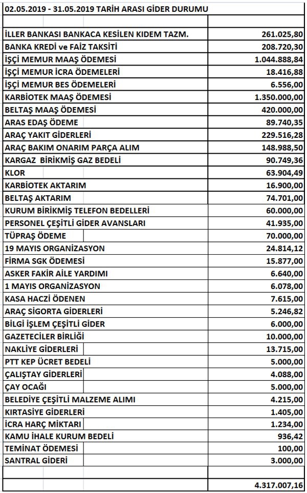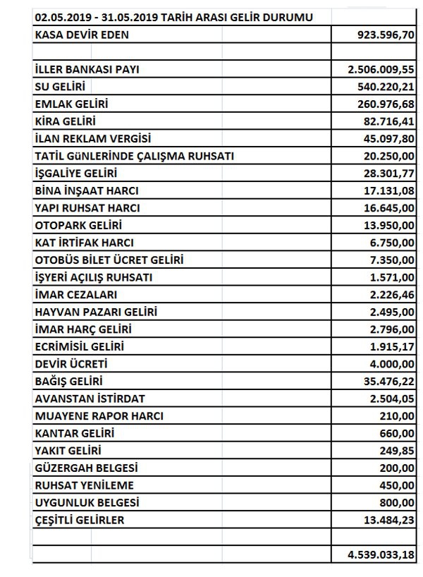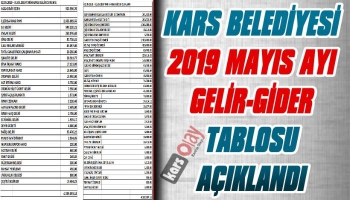 İşte Kars Belediyesinin 2019 Mayıs Ayı Gellir Gider Tablosu.