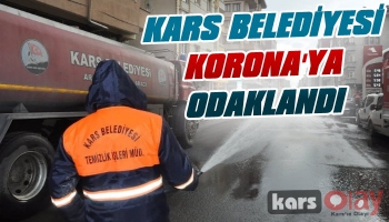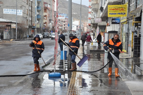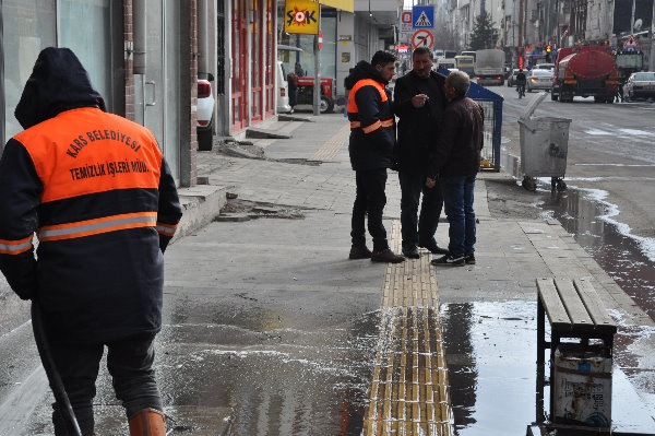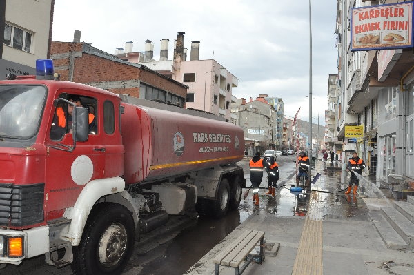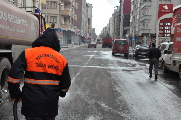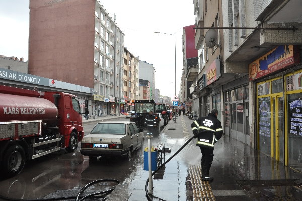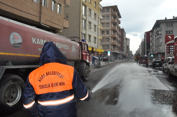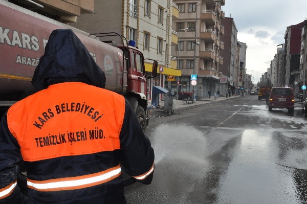 Kars Olay-Kars Belediyesi ekipleri, yeni tip koronavirüs (Kovid-19) salgınına karşı tedbir için cadde, sokak, kaldırımları tazyikli suyla yıkadı.