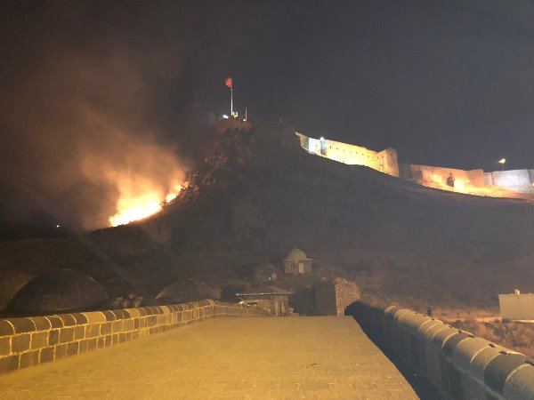 Kars Olay- Kars Kalesinin arka kısmında akşamz saatlerinde başlayan ot yangını korku dolu anlar yaşattı.. Akşam saatlerinde kalenin arka kısmında başlayan ot yangını itfaiye ve polis ekiplerini alarma geçirdi. Vatandaşların kalenin etrafında yangın var ihbarı ile olay yerine gelen itfaiye ekipleri Kars Kalesinin arka kısmında başlayan yangını kısa sürede söndürerek kontrol altına aldı. Polis ekiplerinin de güvenlik önlemi aldığı Kalenin eteklerinde oluşan ot yangını paniğe neden olurken, çıkan yangın daha büyümeden kontrol altına alınarak söndürüldü. Kalenin surlarına kadar dayanan yangının kuruyan otlardan ötürü çıktığı tahmin ediliyor.