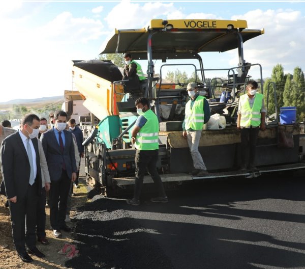 Kars Valisi Türker Öksüz, Arpaçay-Koçköy arasında yapılmakta olan 6 Km'lik Bitümlü Sıcak Karışım (BSK) asfalt aşınma tabakası çalışmasını inceleyerek yetkililerden bilgiler aldı.