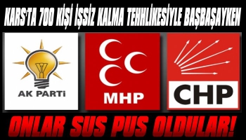 Kars Olay- Kars Belediye'sinde şirketin iflası bahane edilerek 700'e yakın işçinin istifasının istenmesinin ve yeni bir dilekçeyle "özlük haklarından feragat edilerek" bir dilekçe verilme yönünde dayatmasının ardından Kars'taki diğer siyasi partiler olan AK Parti, MHP, CHP'den konu hakkında hiç bir resmi açıklama yapılmaması ve AK Parti Kars İl Başkanı Adem Çalkın'ın, MHP Kars İl Başkanı Tolga Adıgüzel'in, CHP Kars İl Başkanı Mustafa Aras'ın adeta konuya duyarsız kalıp sus pus olmaları ise resmen şehirde siyasi irade sahipleri neden susuyor sorularını akıllara getirdi. Öte yandan Kars'taki tüm gelişmelere her önemli günde ve özel günlerde mesaj yarışna girenlerin kamuyounun gündemini meşgul eden bu denli önemli bir konuda susması ise dikkatlerden kaçmıyor.