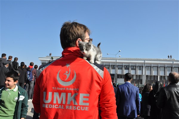 Bir UMKE görevlisi ise kalabalık arasında yolunu şaşıran kedi yavrusuna sahip çıktı. Yavru kediyi omuzlarına alarak koruyan UMKE görevlisi, uzun süre kediyi okşadı. UMKE görevlisinin bu şefkati çevredekilerin de dikkatini çekti. Özellikle de çocuklar UMKE görevlisinden yere indirmesini istedikleri kediyi severek çocukluklarını yaşadılar.