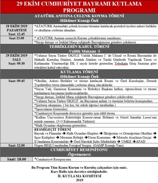 Kars Olay-Kars Valiliği, 14. Mekanize Piyade Tugay Komutanlığı ve Kars Belediyesi çelenkleri hükümet konağı önündeki Atatürk anıtına koyuldu. Kutlama programı ve törenleri 29 Ekim'de hükümet konağı önündeki tören alanında devam edecek.