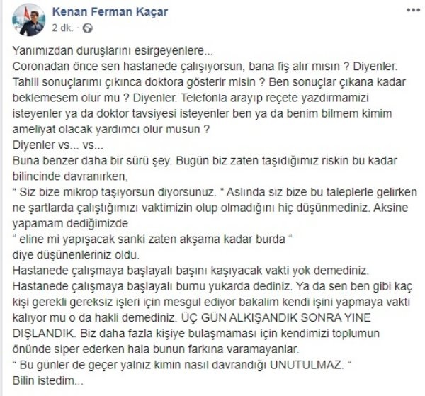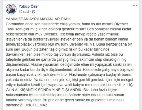 Hastanede çalışmaya başlayalı başını kaşıyacak vakti yok demediniz. Hastanede çalışmaya başlayalı burnu yukarda dediniz. Ya da sen ben gibi kaç kişi gerekli gereksiz işleri için mesgul ediyor bakalim kendi işini yapmaya vakti kalıyor mu o da hakli demediniz. ÜÇ GÜN ALKIŞANDIK SONRA YINE DIŞLANDIK. Biz daha fazla kişiye bulaşmaması için kendimizi toplumun önünde siper ederken hala bunun farkına varamayanlar.