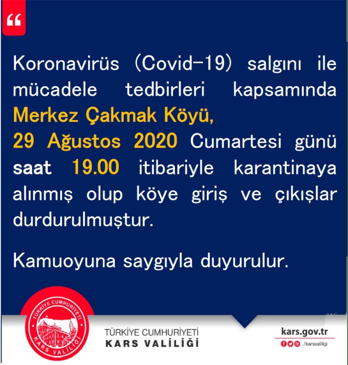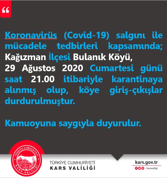 Kars Olay-Kars Valiliği'nden yapılan açıklamada:Koronavirüs (Covid-19) salgını ile mücadele tedbirleri kapsamında; Merkez Çakmak Köyü 29 Ağustos 2020 Cumartesi günü saat 19.00'da ve Kağızman İlçesi Bulanık Köyü 29 Ağustos 2020 Cumartesi günü saat 21.00 itibariyle karantinaya alınmış olup her iki köyde de giriş ve çıkışlar durdurulmuştur." denildi.