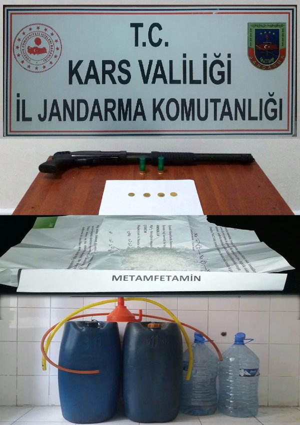 Kars Olay- Kars Valiliği'nden yapılan açıklamada; "İl Jandarma Komutanlığımız tarafından yapılan titiz planlama, çalışma ve takip sonucunda suç işlemek amacıyla örgüt kurmak ve uyuşturucu madde imal ve ticareti yapan şüphelilere yönelik icra edilen operasyon neticesinde; 57 gr Metamfetamin, 22 gr toz esrar, 3 adet uyuşturucu kullanma aparatı, 1 adet ruhsatsız av tüfeği, 4 adet altın sikke ele geçirilmiştir. Faaliyet kapsamında 3 hırsızlık girişimi önleyici tedbirler alınarak önlenmiş, 1 akaryakıt hırsızlığı olayına da suçüstü müdahale edilmiştir.
