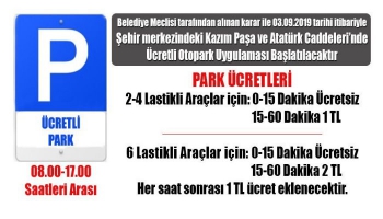 Cadde üzerine park eden araçlar için ilk 15 dakika ücretsiz olup 15 ile 60 dakika için park ücreti 1 TL olarak belirtildi