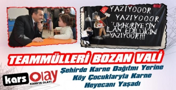 Kars Olay-Okul girişinde öğrenciler tarafından çiçeklerle karşılanan Kars Valisi Türker Öksüz, sınıfları gezerek öğrencilere karneleri ile birlikte çeşitli hediyeler takdim etti. Karne dağıtımında öğrencilerin karne heyecanına ortak olan Vali Öksüz, öğrenciler ile bir süre sohbet ederek yarıyıl tatilini en iyi şekilde değerlendirmeleri tavsiyesinde bulundu.