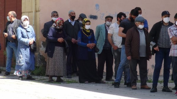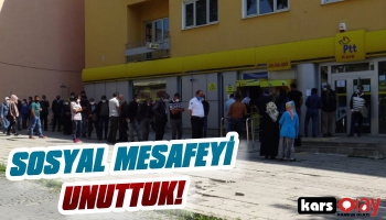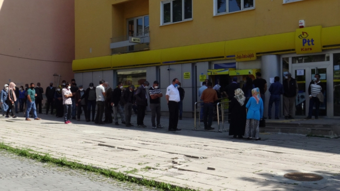 Kars Olay-Kars'ta PTT şubesi önünde 65 yaş maaşı ile engelli maaşı almak için sırada bekleyen vatandaşlar sosyal mesafe kuralına uymadı.