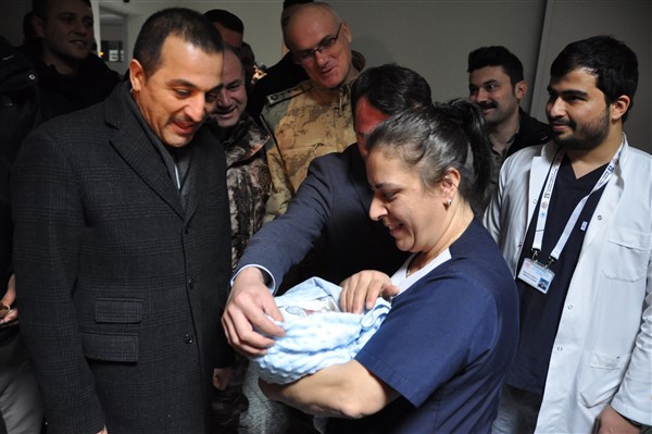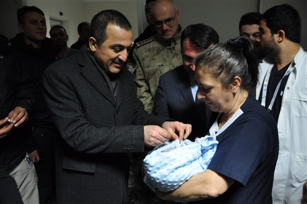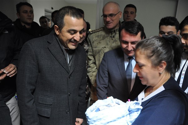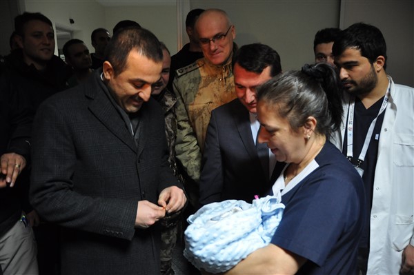 Kars Valisi Türker Öksüz, Kars İl Emniyet Müdürü Yavuz Sağdıç ve Kars İl Jandarma Komutanı Albay Hidayet Arıkan yeni yılın ilk saatlerinde dünyaya gelen çiftin bebeğine altın taktı.