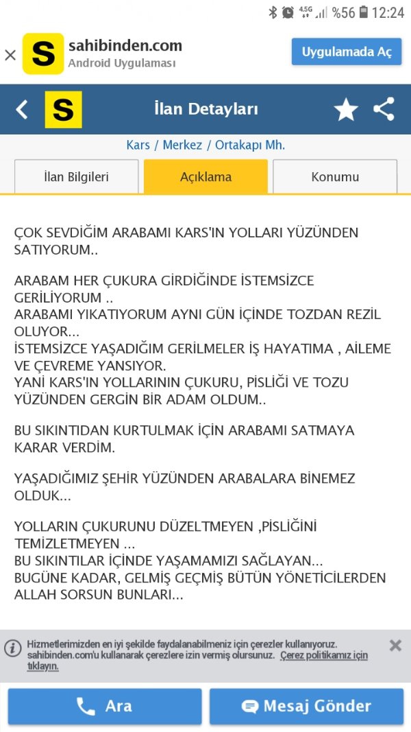 Kars'ın yıllardan beridir bitmeyen yol ve kirlilik sorununu da adeta gözler önüne seren ilanda Göksel Ubiç arabasının ilan detaylarına ise şunları yazdı: "BUGÜNE KADAR, GELMİŞ GEÇMİŞ BÜTÜN YÖNETİCİLERDEN ALLAH SORSUN BUNLARI...