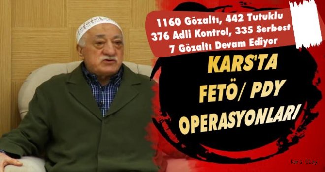 Edinilen bilgilere göre Fethullahçı Terör Örgütü/Paralel Devlet Yapılanmasına yönelik yapılan operasyonlar kapsamında bugüne kadar Kars’ta toplam 1160 kişi gözaltına alındı. Bunlardan 442’si çıkarıldıkları mahkemece tutuklandı. 376 kişi adli kontrol, 335 kişi çıkarıldıkları mahkemece serbest bırakılırken, 7 kişinin de gözaltı süresi devam ediyor. - Kafkas Haber Ajansı