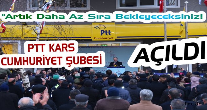 Bugün havayolu ile Kars'a gelerek bir dizi açılış gerçekleştiren Bakan Arslan'ın Kağızman ziyeri sonrasında bir başka açılışı gerçekleştireceği nokta Kars Merkez oldu. Eski Telekom Başmüdürlüğü hizmet binası yıkılarak yerine PTT Cumhuriyet Şubesi yapılmış, bugün ise Ulaştırma Denizcilik ve Haberleşme Bakanı Ahmet Arslan tarafından Kars'a hizmet vermesi üzere PTT Cumhuriyet Şubesi'nin açılışı gerçekleştirildi. Açılış programında önce PTT Mehteran takımının sunduğu gösteri sonrasında istiklal marşı ve saygı duruşunun ardından yapılan protokol konuşmaları sonrasında PTT Cumhuriyet Şubesi kurdela kesilerek hizmete sunuldu.