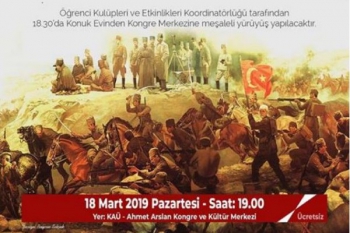 Kars Olay- Kafkas Üniversitesi (KAÜ) Devlet Konservatuarı ve Öğrenci Kulüpleri Koordinatörlüğü tarafından 18 Mart Pazartesi günü Çanakkale Deniz Zaferi'nin 104. Yılı anma etkinlikleri gerçekleştirilecek.