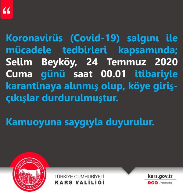 Kars Olay-Kars Valiliği Koronavirüs (Covid-19) salgını ile mücadele tedbirleri kapsamında Kars'ın Selim İlçesi Beyköy Köyü'nün karantinaya alındığını ve 24 Temmuz 2020 Cuma Saat:00:01 itibariyle giriş çıkışların durdurulduğunu bildirdi.