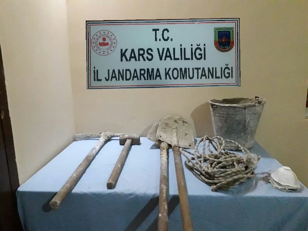 Kars Olay-Kars Valiliği kontrolünde, İl Jandarma Komutanlığı tarafından 30.11.2019 tarihinde Selim İlçesi Yamaçlı Köyünde bir şahsın evininin içinde define bulmak amaçlı izinsiz kazı yapan 5 şüpheli şahıs suç aletleriyle birlikte yakalandı.