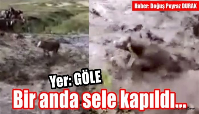 Kars Olay- Ardahan'ın Göle ilçesinde etkili olan sağanak ve dolu, Tellioğlu köyünde sele neden oldu. Köy içinden geçen derenin taşması sonucu merada otlatılan hayvanlar, güçlükle getirildi. Çobanların taşan dereden geçirmeye çalıştığı sürüdeki buzağı ise sel sularına kapılarak sürüklendi. Bir süre sonra gözden kaybolan buzağı, yaklaşık 100 metre sürüklendiği dereden çıktı. Sel sularına kapılan buzağının sürüklenme anı ise çevredekiler tarafından cep telefonu kamerasıyla kaydedildi. Merada otlatılan diğer hayvanları ise çobanlar güçlükle köye getirdi.