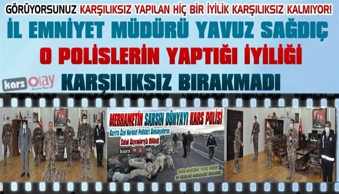 Kars Olay-Kars Emniyet Müdürü Yavuz Sağdıç, geçtiğimiz günlerde sokak hayvanlarını kumanyalarıyla doyuran polisleri makamında kabul ederek ödüllendirdi.